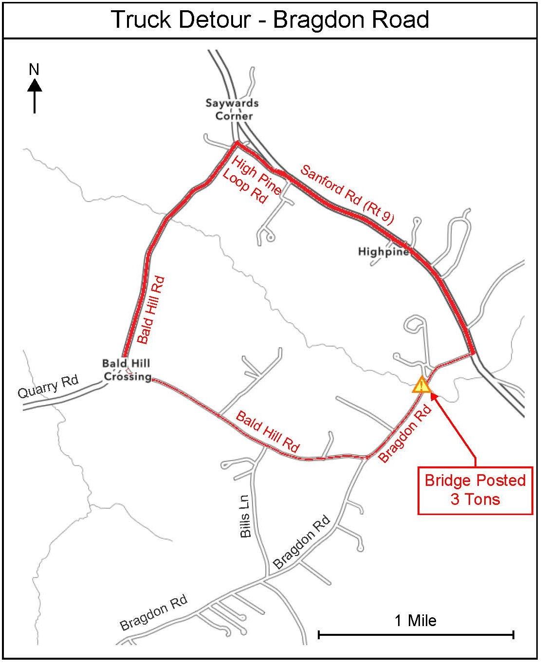 The bridge on Bragdon Road is being posted with a maximum weight limit of 3 tons. All vehicles heavier than the posted limit that need to get from one end of Bragdon Road to the other should use nearby Bald Hill Road, High Pine Loop Road and Sanford Road as an alternate route.  At this weight limit, vehicles such as school buses, fire trucks, oil delivery trucks and dump trucks will not be able to use this bridge.  Cars and Light Duty pickup trucks will still be able to use this bridge.